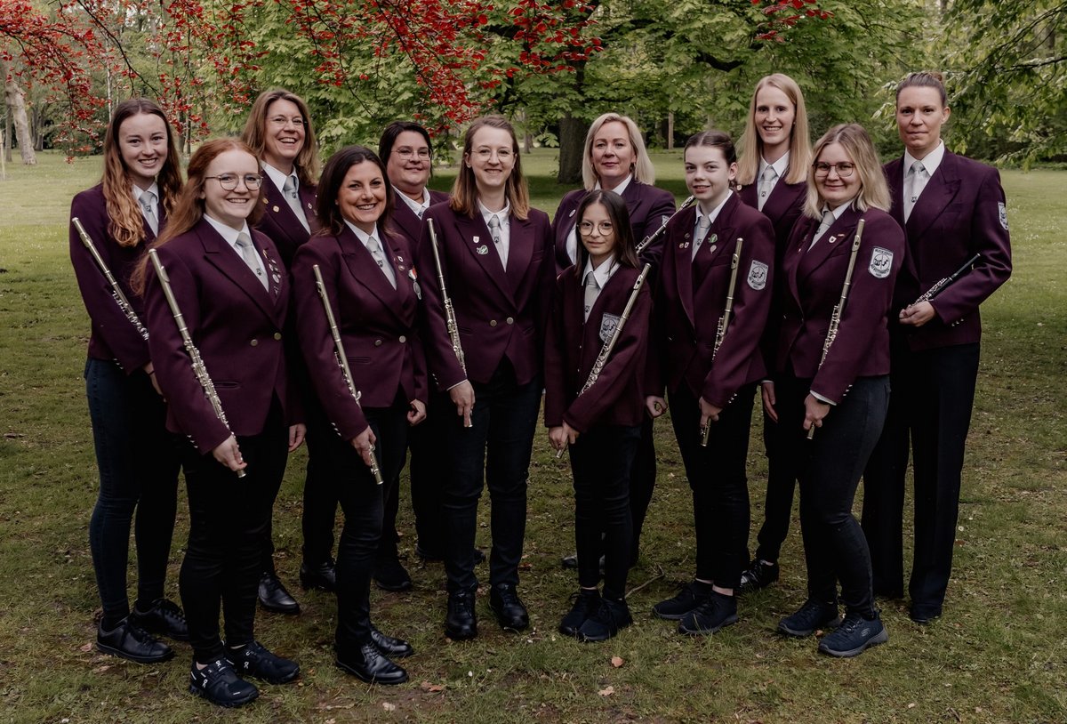 Wir, die 12 Querflötenspielerinnen, sitzen in der ersten Reihe. Wir sind ein junges und - wie bereits erwähnt - ein sehr weibliches Register. So kann es auch mal passieren, dass während der Probe etwas mehr geredet wird aber - wie manch ein anderes Register vielleicht denkt - nicht über Privates, sondern natürlich nur über das jeweilige Musikstück, das geprobt wird. Uns ist nämlich allen wichtig, bestmöglich zu spielen. „Wir“, dass sind v.l. Selina, Franziska, Claudia, Verena, Sylvia, Lisa, Noemi, Verena, Mona, Julia, Fabienne und Vera.