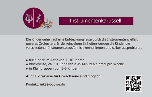Im Instrumentenkarussell wirst Du all unsere Instrumente ausprobieren und ausführlich kennenlernen. Vielleicht entdeckst Du dabei eine Vorliebe für ein Instrument, das Du vorher noch gar nicht kanntest.